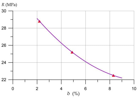 Analysis of the results presented in Table 5 allows us to draw the following conclusions. The proportion occupied by cracks after applying a load of 10 tons on the sample decreases after the addition of silica fume and fiber. The control + GF + MS sample has the smallest proportion occupied by cracks. The decrease in the proportion occupied by cracks is mainly accompanied by an increase in the compressive strength of the specimens. The dependence of the change in compressive strength (R) on the proportion of cracks (δ) in the photographs of the microstructure of the samples is shown in Figure 7.
