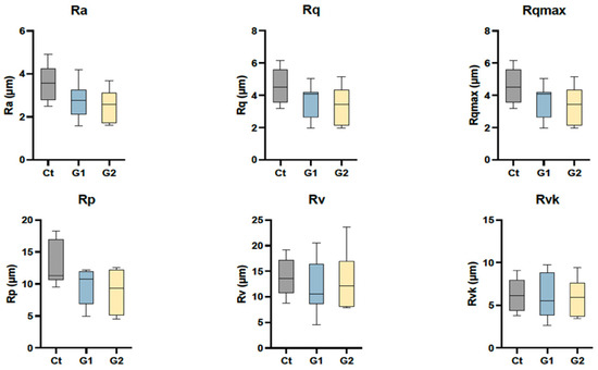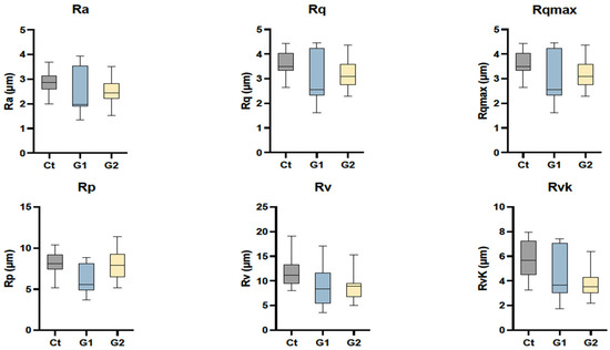 Figure 3 shows the variation in surface roughness in the experimental groups at T2. There were statistically significant differences between the control group and group 1 for the parameters: Ra (p = 0.0043), Rq (p = 0.0043), Rqmax (p = 0.0043), Rp (p = 0.0087), and Rv (p = 0.026). There were no statistically significant differences for the Rvk parameter (p > 0.05).