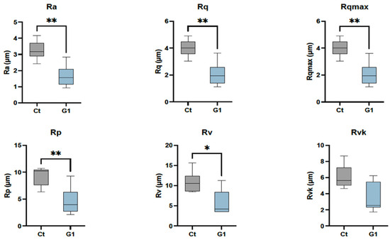 Surface roughness variation in the experimental groups at T2 (Ct—Control Group, G1—group 1). * means p < 0.05; ** means p < 0.01.
