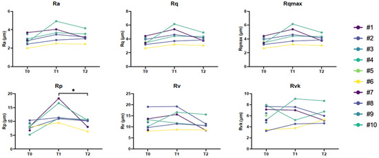 In all the parameters evaluated, there was an increase in roughness between T0 and T1 followed by a decrease between T1 and T2, but without statistical significance (Figure 4). The greatest difference was recorded at T1 in the Rp parameter and the difference between T1 and T2 in this same parameter proved to be statistically significant (p = 0.0366).