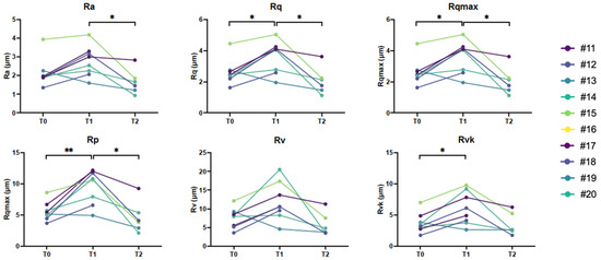 Surface roughness variation in group 2 throughout the experimental protocol over time (T0 to T1). #1 to #10—number of teeth (some samples fractured and were removed from the study). * means p < 0.05.