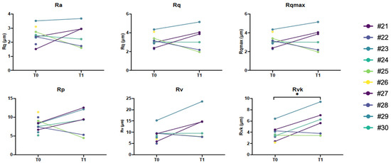 Variation in surface roughness throughout the experimental protocol in the control group over time (T0 to T1). #1 to #10—number of teeth (some samples fractured and were removed from the study). * means p < 0.05.