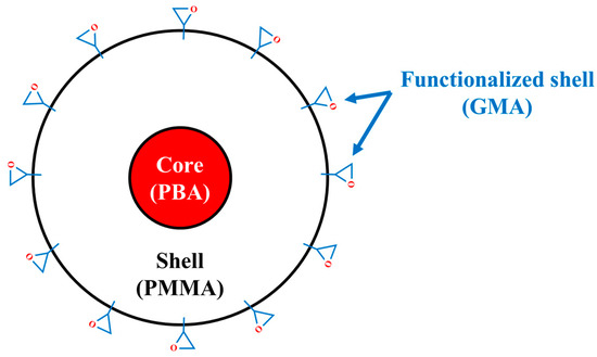 The two-by-two twill CF (HexForce 48302 WE1270) weave fabric was supplied by Hexcel Corporation USA, utilizing IM2C-12K grade CF tows. The fabric has an areal density of 300 g/m2 and features a balanced tow construction with a yarn density of 3.35 yarn/cm in both the wrap and weft direction. The polymer matrix, a 0.5 mm thick PA6 (Sustamid-6) film, was procured from the Röchling Group, Germany (melting point of 220 °C). All mechanical properties of CF fabric and PA6 are tabulated in Table 1. The grade of CSPs was Paraloid EXL-2314 and they were supplied by Dow Chemical Pacific (Singapore) Private Limited, featuring a core-shell architecture with a rubbery cross-linked poly–butyl–acrylate (PBA) core and a glassy poly (methyl methacrylate) (PMMA) shell as shown in Figure 1. Notably, the PMMA shell is functionalized with glycidyl methacrylate (GMA) groups, which facilitate reactions with polyamides, and epoxies resins. The reaction mechanism involves the amine group in polyamides reacting with the epoxy ring of GMA, forming covalent bonds that improve compatibility within the blend. The particles have an overall micro-size of 550 nm with a core-to-shell weight ratio of 20 to 80%, as specified by the supplier.