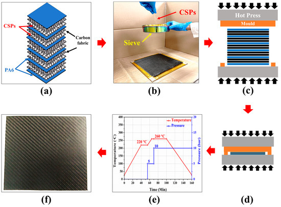 Manufacturing Process for CF/PA6 composites; (a) CSPs dispersed at the ply interfaces; (b) Manual dispersion of filler using a sieve; (c,d) Hot press compression molding; (e) Two-step consolidation cycle; (f) Manufactured composites.
