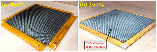 Initially, the lay-up sequence was designed in which 10 layers of CF fabric, each measuring 28 cm × 28 cm, were alternated with 6 films of PA6, each measuring 25 cm × 25 cm and weighing 35.62 g, in a specific sequence. The strategic positioning of the polymer films and fabric was optimized to ensure uniform distribution of the matrix throughout the fiber network for high-quality composites (refer to Figure 2a). During the layup process, 8.54 g of CSPs, equivalent to 4 wt% of the polymer mass, were dispersed using a sieve (refer Figure 2a) and distributed evenly across all five CF ply interfaces, with 1.70 g applied per ply interface. The particles were carefully sprinkled onto the sieve, facilitating their controlled deposition at the ply interface and fabric interstices (refer to Figure 2b). The dispersion process was assisted by a sieve with a mesh size of 180 µm to prevent agglomeration issues and achieve uniform spread of CSPs on the CF fabric. The quality of dispersion was visually examined, as depicted in Figure 3a,b, which showed the dispersion of filler on the ply interface and fabric interstices for 2 wt% compared to pristine.