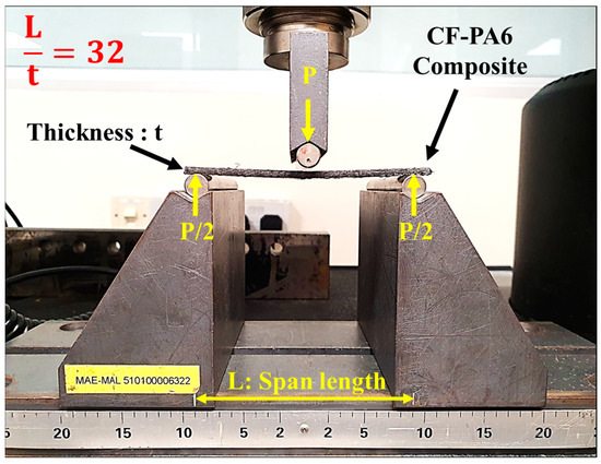 The three-point bend test was carried out following ASTM D7264 [46] standard for the flexural specimens, which had a span length-to-thickness (L/t) ratio of 32, as illustrated in Figure 4. The test was conducted using an Instron testing equipment coupled with a 50 kN load cell and a crosshead speed of 1 mm/min. The samples were produced following ASTM standard, and the dimensions of the samples were (115 × 13 × 3) mm. Instron 5569 Blue-hill software (version 4.01) was used to control the test and analyze the collected data. This test was performed to determine the flexural performance values such as stiffness and strength of composites.