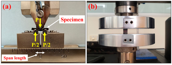 The short beam shear (SBS) tests were conducted following ASTM D2344 [47] to determine ILSS and the fixture used is shown in Figure 5a. The tests were conducted using a Shimatzu machine (autograph AG-X series) with a crosshead speed of 1.0 mm/min with a load cell capacity of 10 kN. Six samples were tested for all the composites. The samples were produced following ASTM standard, and the dimensions of samples were 18 mm × 6 mm × 3 mm. The ILSS was calculated using the formula suggested by standard in which maximum load within the elastic limit, sample width, and thickness were used.