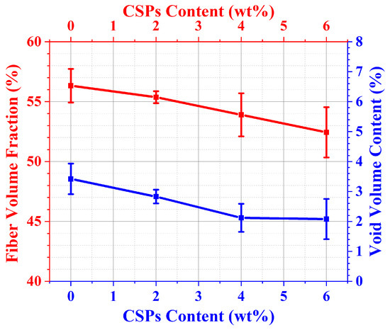 Figure 6 illustrates the trend of the determined values concerning CSP content in weight percent. The trend showed that the fiber volume content decreased from 56.33 ± 1.40% for pristine composites to 52.44 ± 2.12% for composites containing 6 wt% CSPs, illustrating that the incorporation of CSPs led to the replacement of polymer matrix, ultimately reducing the fiber volume content. The results were further corroborated by determining the void volume content (Vc). In pristine composites, the high viscosity of PA6 during the hot press consolidation process (low shear rate) reduced its flow, potentially leading to void formation within the composites. The Vc was determined using Equation (2), as suggested in ASTM D2734 [50] standard:
