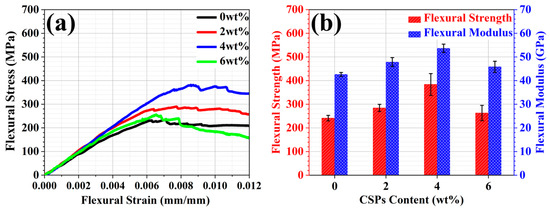 Three-point bend tests were performed to determine the flexural strength and modulus of CF/PA6 laminates modified with CSPs. The impact of varying CSPs content on the flexural performance of the laminates was examined and compared with the original composites. Figure 7a illustrates the characteristic stress versus strain curve for the composites and the effects of CSPs on the prepared composites. In Figure 7a, none of the specimens experienced a sharp fracture, indicating that the failure was primarily due to matrix cracking and minor delamination. Figure 7a also demonstrates that the 2 wt% and 4 wt% CSP-modified composites experienced delayed failure occurrence, as indicated by the delayed maximum stress peak compared to the pristine composites. However, for the 6 wt% CSPs modified composites, the stress peak was similar to that of the pristine sample. This can be attributed to the higher concentration of CSPs at the ply interfaces, which increased cohesion between particles, thereby promoting faster crack propagation and reducing flexural strength. Furthermore, the non-uniform CSPs distribution at the ply interfaces likely contributed to premature failure in the composites.