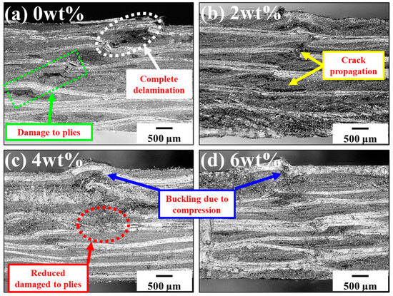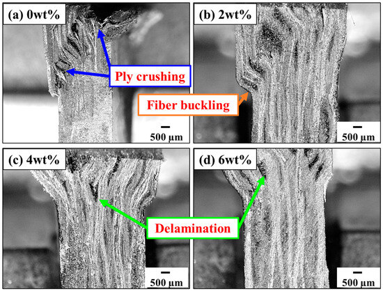 Side cross section (upper section) of compression samples and identified damage modes using the microscope for (a) 0 wt%; (b) 2 wt%; (c) 4 wt%; and (d) 6 wt% CSPs modified composites.