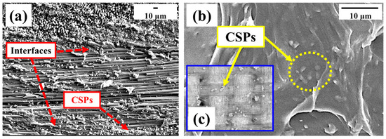 The reinforcement of CSPs into CF/PA6 laminates led to comparable behavior across 2, 4, and 6 wt% samples, except for the delay in failure and improvement in flexural strength. Figure 8c clearly demonstrates reduced ply damage in 4 wt% composites compared to Figure 8a for pristine composites. When CSPs were incorporated within the matrix, either embedded in the fabric tows or exposed PBA core, they acted as a hindrance to crack initiation and growth, thereby significantly delaying the failure. When CSPs were located at the ply interfaces, they facilitated bonding between fabric layers. The dispersion of CSPs at fabric interfaces and within the matrix is evident in the SEM images depicted in Figure 9a,b. Notably, Figure 9c verifies the CSPs morphology observed through the optical microscope. As crack density reached its maximum, the delamination commenced in the composites. However, in CSPs modified composites, the availability of CSPs at ply interfaces strengthened the bonding between fiber bundles, resulting in improved flexural strength compared to unmodified composites.