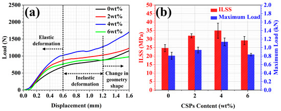 Figure 10a depicts the force versus deflection curve for all the composites. The maximum ILSS of the laminates is determined by the peak load it can bear along the axial direction. After reaching this peak, continued load application results in plastic deformation and fiber compaction, altering the specimen’s geometry. Consequently, a maximum deflection of 0.60 mm was chosen to calculate ILSS. As shown in Figure 10b, the average ILSS values for CSPs content of 0, 2, 4, and 6 wt% were 24.66 ± 2.08 MPa, 31.91 ± 1.21 MPa, 34.91 ± 4.44 MPa, and 29.12 ± 2.42 MPa, respectively. The most significant improvement was noted in the 4 wt% composites, which demonstrated a 41.56% increase in ILSS. This improvement can be due to the high-quality laminate with minimal void volume content at higher concentrations of CSPs, as well as the excellent compatibility between particles, matrix, and fibers. As previously mentioned in the flexural properties section, the interaction between CSPs and fiber surfaces creates strong interfacial adhesion, leading to mechanical interlocking and improved shear properties. However, when CSPs content increased to 6 wt%, the greater amount of PMMA shell available at the ply interface may lead to more pronounced cohesion between particles, forming a relatively large domain of CSPs, thereby increasing ply interface thickness. This promoted faster crack propagation at the ply interface and ultimately reduction in ILSS. Additionally, the non-uniform distribution of CSPs at higher concentrations caused inconsistencies at the ply interface, contributing to the premature failure of the composite under shear loading.