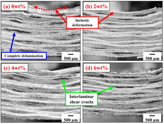 Side cross section (center region) of short beam test samples and identified failure modes using microscope for (a) 0 wt%; (b) 2 wt%; (c) 4 wt%; and (d) 6 wt% CSPs modified composites.