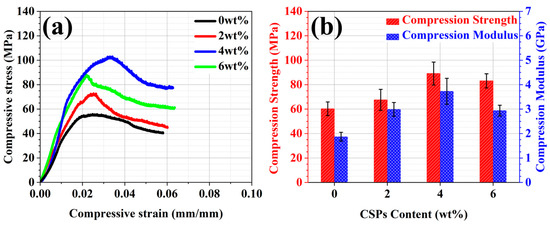 The influence of CSPs on the compressive properties was assessed and compared to composites without CSPs (0 wt%). Figure 12a illustrates the compressive stress-strain curves for pristine and CSP modified CF/PA6 laminates. Notably, the compressive load rises linearly with displacement. The maximum stress point provided the compression strength, while the slope of elastic region provided the compression modulus. As the compression plate moved down, the material reached its yield point, and a sudden load drop was observed. This behavior suggests that the composites experienced multiple-ply cracking, fiber bundle buckling, crushing, and delamination. The incorporation of CSPs led to improvements in both compressive strength and modulus, as summarized in Figure 12b. Specifically, adding 4 wt% particles to the CF/PA6 laminates led to a significant enhancement in compressive strength and modulus, rising from 60.29 ± 5.68 MPa in the pristine composites to 83.12 ± 2.94 MPa, reflecting a 47.83% improvement. However, further increasing the CSP content to 6 wt% resulted in lower compressive strength and modulus due to significant cohesive interaction among the particles at the ply interface, forming a relatively large domain at the ply interface, which led to faster crack propagation.