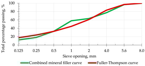 In this experimental study, a reference composition of a self-compacting high-performance concrete [43] (HPC) matrix [44] was prepared. Different compositions of fibre-reinforced high-performance [41] concrete (FRHPC) [45] were designed by adding equal volumes of fibre. Table 1 displays the composition of the reference HPC [46] mix. Proportions between the mix components were calculated using the Fuller–Thompson model [47] to achieve the optimum grading curve (Fuller–Thompson model degree n = 0.45 and aggregate maximal size Dmax = 6 mm). This curve was specifically selected to ensure dense microstructural packing, as depicted in Figure 1. The chosen curve was instrumental in achieving dense microstructural packing, optimizing mix workability, and ensuring the necessary distribution of cement paste fibres, considering our previous experience [48,49,50].