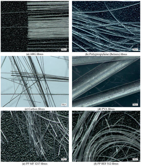 Optical micro-photos of the different non-metallic microfibers are presented in Figure 2 to evaluate their geometrical shape and surface roughness. This helps to understand the morphology of the fibres, the formation of the contact zone with the cement matrix, and the fibres’ distribution. All micro-images are presented at the same scale. The carbon and AR glass fibres [53] have the lowest diameter and a high modulus of elasticity, compared with the used polymer fibres. The high modulus determines the fibres’ inelasticity and straight shape (see Figure 2a). It is also necessary to note that the ARG and carbon fibres are supplied in bundles, which can be decomposed during mixing, depending on the mixing intensity.
