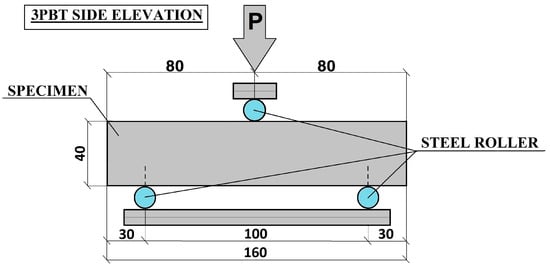 Since the mixture did not contain large coarse aggregates, the size of the samples used was set as 40 mm × 40 mm × 160 mm; oiled steel moulds were used. The samples were compacted for 30 s using a vibration table, with a frequency of 3000 rotations per minute. The samples were removed from the formworks after 48 h of curing at 20 °C ± 2 degrees and 95% air humidity, standard requirements. The specimens were then cured via water immersion at room temperature. Twenty-four hours before testing, the samples were removed from the water, cured in an air-dry condition at a temperature of 20 °C ± 2 degrees and air humidity of 50 and tested at the age of 28 days.