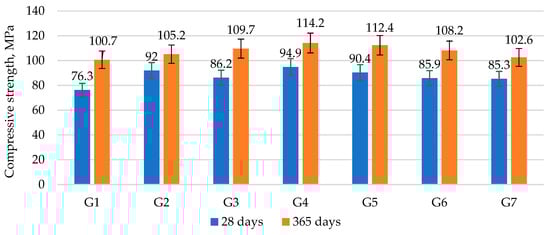 The inclusion of fibres consistently improved compressive strength across all samples. Notably, the carbon fibre mix (G4) achieved the highest compressive strength (95 MPa after 28 days), outpacing other fibre types due to the high E-modulus of carbon fibres. Over time (365 days), the carbon fibre mix maintained its superior strength, showing a 13% improvement over the reference sample without fibres, while other fibre-reinforced mixes, including PVA and ARG, demonstrated similar trends of strength gains over the long term.
