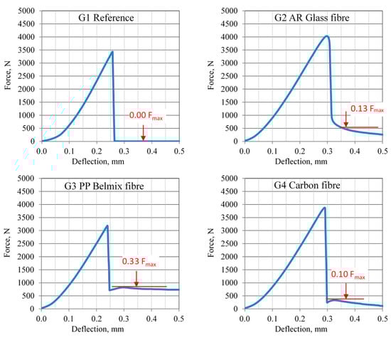 The flexural behaviour of all compositions indicated post-cracking strength-softening character. The residual strength was heavily influenced by the elastic properties of the fibres. ARG and carbon fibres, with high E-modulus and low ultimate elongation, exhibited lower residual post-cracking forces of 0.13 and 0.10 Fmax, respectively, due to their brittle nature. PVA fibres demonstrated the best post-cracking performance, with a residual post-cracking force of 0.45 Fmax. This is attributed to their strong chemical bonding with the cement matrix, as confirmed by SEM images showing cement hydration products on the PVA fibre surface. PVA fibres’ ductile behaviour and high elongation allow them to bridge cracks effectively, enhancing toughness and delaying failure.