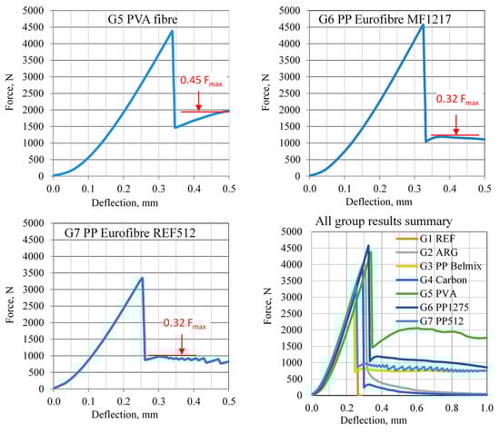 The PVA fibres have the biggest diameter (200 μm fibres; 30 times the diameter of the carbon fibres) (Figure 2c). These fibres are also rigid and straight, which is associated with their large diameter and relatively high E-modulus. In turn, all polypropylene-based fibres are very ductile [54] and flexible, which is associated with their low E-modulus and relatively small diameter (Figure 2d–f).