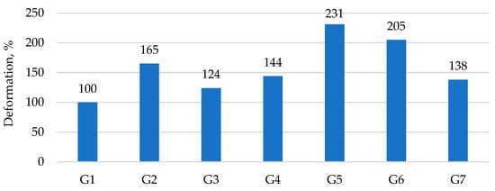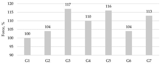 In the G3 mix with “Belmix” fibres, a cone slump diameter of 140 mm was recorded. As per the data in Table 3, this mix, comprising all polypropylene fibres, displayed the lowest aspect ratio of 353. Conversely, the G6 and G7 mixes exhibited identical cone slump diameters, each with aspect ratios of 779 and 606. The mix G4, containing carbon fibres, demonstrated the lowest workability, accompanied by a cone slump diameter of 10.5 cm and an aspect ratio of 1714. Therefore, the overarching conclusion is that a smaller fibre length-to-diameter ratio correlates with improved concrete workability, considering that fibre diameter impacts the specific surface area.