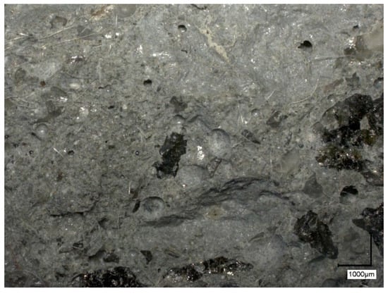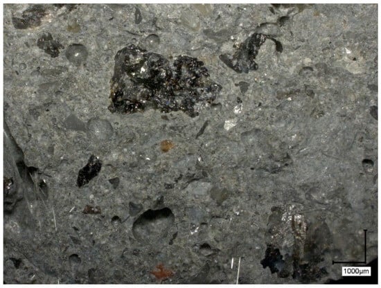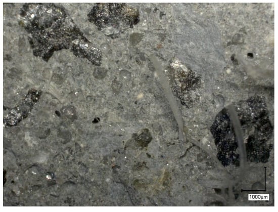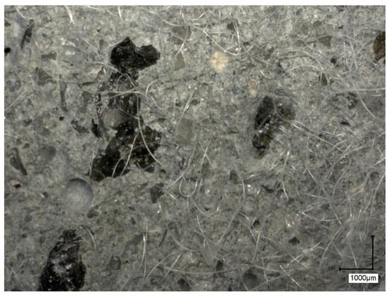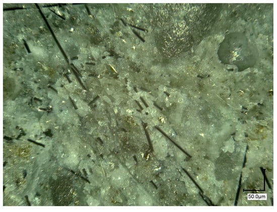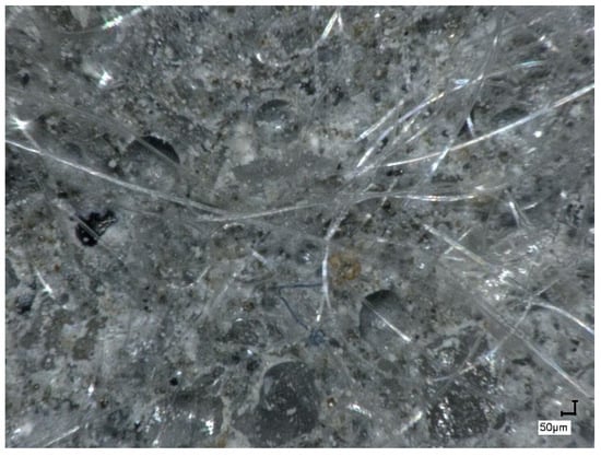The visual inspection of the optical images shows that the incorporation of the fibres resulted in an increase in the larger pores of the FRHPC, which can be seen clearly in Figure 9, Figure 10, Figure 11, Figure 12, Figure 13, Figure 14, Figure 15, Figure 16, Figure 17 and Figure 18. It must be noted that a direct porosity measurement, such as mercury intrusion porosimetry, is needed to characterize porosity quantitatively.
