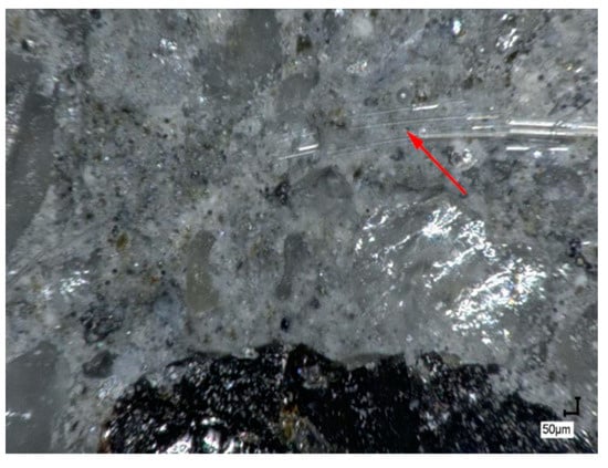 Observing the cross sections of destruction areas (see Figure 9, Figure 10, Figure 11, Figure 12, Figure 13, Figure 14, Figure 15, Figure 16, Figure 17 and Figure 18), some conclusions can be drawn regarding the work of fibres and their volumetric distribution. Long and curved remaining parts and curved fibre remains indicate the viscoelastic behaviour of the fibre after fracture: the fibre is stretching and partially going out from the channel showing ductile behaviour. Such behaviour is characterised by PP and PVA fibres.