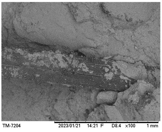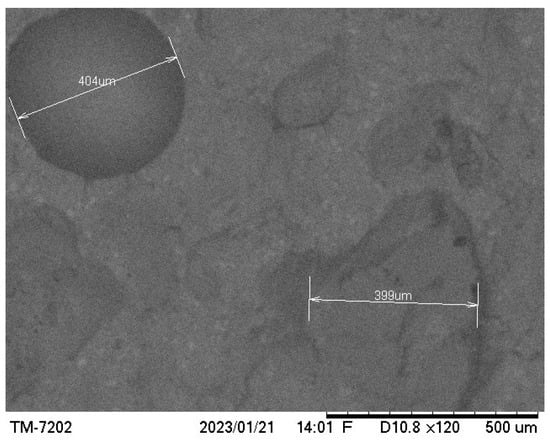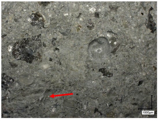 To enhance our comprehension of the interface between fibres and the cement matrix, we have included additional SEM images depicting remnants of materials post-mechanical tests. In Figure 19, the reference mix without fibres is illustrated, showcasing visible air pores with a diameter of 0.4 mm and fine aggregate particles. Moving to Figure 20, we focus on the contact area between the PVA fibre and the cement matrix. This image reveals the presence of cement hydration products on the surface of the PVA fibre, aligning with findings from other studies [5,52], which suggest that the PVA fibre induces the formation of dense structures around it, potentially attributable to its hydrophilic surface. Similarly, the results obtained by the author [36], who analysed SEM images with PVA fibres, indicate that the fibre’s surface is entirely covered by hydrated products, emphasizing a strong affinity between the fibre and the cementitious matrix.