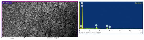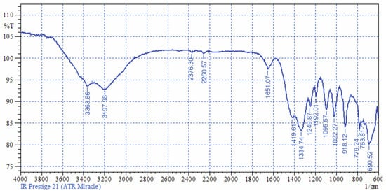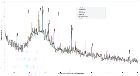 Figure 4 shows the IR spectrum of the chromite pigments, from which it follows that: absorption spectra with wavelengths of 3363.86–3197.98 cm−1 characterize the presence of hydroxyl groups (CrO-OH); absorption spectra with wavelengths of 2376.30–2260.57 cm−1 characterize the presence of chromite pigments groups (KCrO2); absorption spectra with wavelengths of 1651.07 cm−1 characterize the presence of chromite pigments groups (K2CrO4); absorption spectra with wavelengths in the range of 1419.61 cm−1 characterize the presence of chromite pigments groups (K3CrO4); absorption spectra with wavelengths in the range of 1334.74 cm−1 characterize the presence of chromite pigments groups (K4CrO4); absorption spectra with wavelengths in the range of 1249.87–1192.01 cm−1 characterize the presence of chromite pigments groups (K2O·Cr2O6); absorption spectra with wavelengths in the range of 1095.57–1022.27 cm−1 characterize the presence of chromite pigments groups (CrO); absorption spectra with wavelengths in the range of 918.12–779.24 cm−1 characterize the presence of chromite pigments groups (CrO2); absorption spectra with wavelengths in the range of 763.81–690.52 cm−1 characterize the presence of chromite pigments groups (Cr2O3).