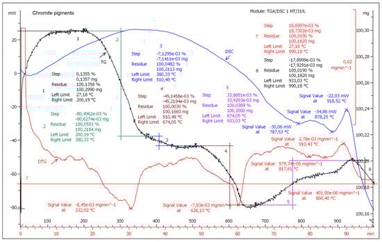 From Figure 3, the mass of the chromite pigments depends on time and temperature. This is evidenced by the changes in their mass at different temperatures: (1) 200.19 °C—100.299 mg; (2) 380.33 °C—100.218 mg; (3) 510.48 °C—100.211 mg; (4) 674.05 °C—100.166 mg; (5) 933.03 °C —100.200 mg; (6) 990.21 °C—100.182 mg. According to the results of the thermogravimetric analysis, it was found that the chromite pigment mass loss in the temperature range of 200.19–990.18 °C within 94 min is 0.117 mg.