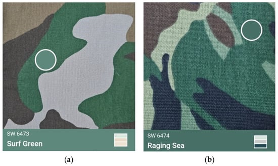 Studies of the color characteristics of pigments from technogenic wastes applied to different types of fabrics showed that when using the same paste recipe, the Alatau fabric, article 1001, was dyed SW6473 Surf Green, and the Arlan blended fabric, article 6005, was dyed SW6474 Raging Sea. The results of the studies are shown in Figure 6a,b, respectively.