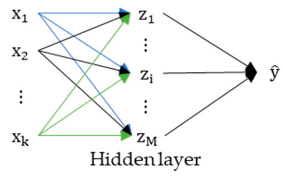 The radial basis function , according to Equation (6), is used as a transfer function defined by the radial distance between the values and the function’s center as well as a shape parameter :