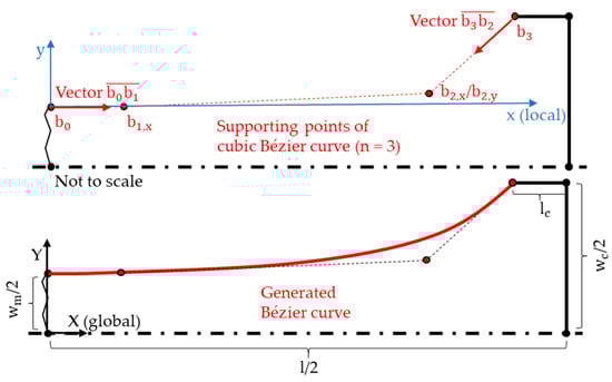 For the optimization of the tapered section, the mathematical description of a spline by a classical polynomial approach can be very complex due to the influence identification of polynomial coefficients on the geometry. Therefore, the Bézier representation is chosen, based on the work of Casteljau [37] and Bezier [38], for a parameterized description of freeform curves [39,40,41]. With this approach, a cubic Bézier curve (n ∈ [0;3]) is fully represented by the definition of four supporting points with coordinates (Figure 2). Table 2 indicates the coordinates of the four points in the model’s local coordinate system with its origin in supporting point (Figure 2). According to Figure 2, the coordinates of the control points and are fixed in the local coordinate system and only depend on the basic parameters. Moreover, a geometrically continuous spline connection to the mid-section of the specimen is defined as optimization’s boundary condition to impede any stress concentrations in the test material. This leads to a horizontal vector (Figure 2) and a fixed coordinate = 0, reducing the optimization parameters to four (, ).