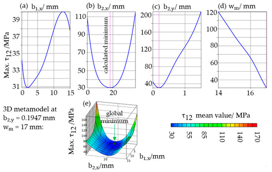 Each plot in Figure 4a–d depicts the values on the 2D cutting plane through the global minimum of Max() of the five-dimensional metamodel. Max() shows a non-linear dependency on all Bézier point coordinates with a calculated minimum at = 1.910, = 17.813 and = 0.195. Only for , an almost linear -dependency over the considered parameter area (Table 2) is present. With increasing width of the specimen’s mid-section, the maximum shear stress in the tapered section decreases. This is plausible due to a smaller difference between clamping and mid-section following a reduced load diversion in the specimen. Therefore, the minimum value in the parameter area = 17 mm is chosen, resulting in a 1 mm width decrease over the specimen length. Figure 4e shows the 3D response surface of the metamodel with its global minimum at = 31.78 MPa, fulfilling the objective function with the parameters mentioned above. The accuracy of the metamodel together with the summarized metamodel results are given in Table 3.