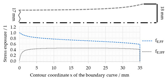Figure 5 shows and over the contour coordinate x of the tapered specimen’s edge. From the clamping area ( = 18 mm at x = 35 mm) to the specimen’s mid-section ( = 17 mm at x = 0 mm) increases, reaching the failure threshold value ( = 1) at the mid-section. In contrast, the IFF stress exposures do not exceed the threshold value of one. forms an almost homogeneous plateau along the contour due to a successful spline optimization. The analyzation identifies a clear fiber failure in the specimen’s mid-section. Based on these stress exposures, the form factors and fracture-type numbers β of the CF-PC-UD and -KV laminate layups are shown in Table 4.