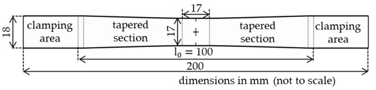 Testing methods are developed based on scientific findings (e.g., Junginger [15]) and are often transferred to procedural instructions and international standards. These guidelines, in combination with test specimen definitions for short-term dynamic tensile testing, already exist for metals [7,16,17,18] and unreinforced as well as short and long fiber reinforced plastics [19,20,21]. The specimen definition for strain rate testing of cFRTP is the subject of this research. The actual focus in the literature is on composites with thermoset matrices. Table 1 summarizes different specimens with a dogbone (Fitoussi et al. [22], Todo et al. [23]), tapered (Spronk et al. [8], Chen et al. [24], De Baere et al. [25], Gilat et al. [26]), and rectangular shape (Hufner/Hill [27]). In comparison, not only the specimens’ shapes but also the dimensions vary widely. The only commonality is the use of circle segments with radii r for implemented geometry discontinuities (e.g., tapered sections or dogbone shape).