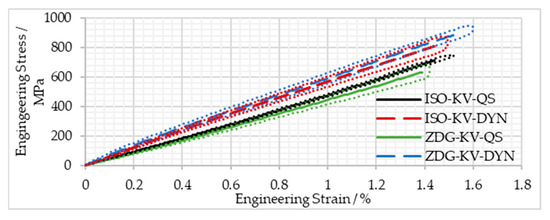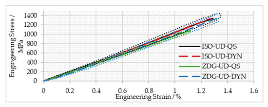 To prove the numerical optimization results, an experimental validation of the specimen geometry is conducted, performing quasi-static tensile tests at a test speed of 2 mm min−1 (QS) as well as high-speed tensile tests at 4000 mm s−1 (DYN). To compare the test results of the tapered specimen (ZDG) to results of a rectangle reference geometry (ISO), specimens based on the standard ISO 527-5 [47] are tested in addition. In Figure 7 and Figure 8, the experimental mean curves (engineering stress-strain curves and their standard deviation based on at least five valid test results) for CF-PC-UD and CF-PC-KV of both specimen geometries are shown.