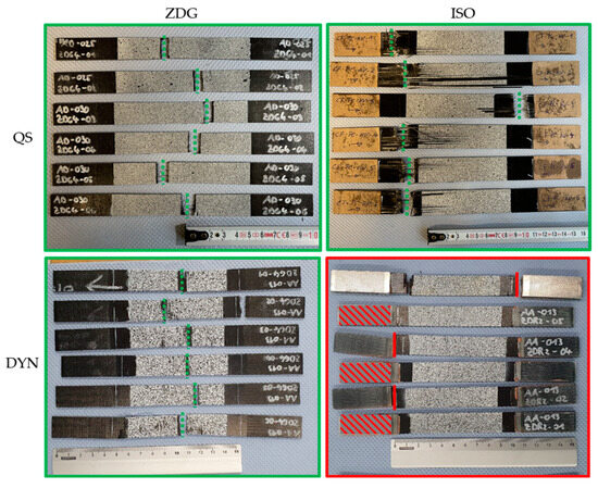 Failure pattern of tested CF-PC-KV specimen batches: ZDG (left) and ISO (right) at test speeds QS (first row) and DYN (second row); dotted lines indicate first tensile failure; shaded areas indicate specimen slipping in clamping area.