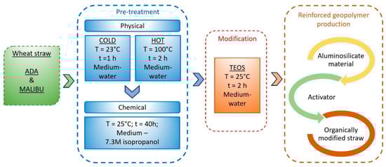 Therefore, the effect of physical wheat pre-treatment methods and straw functionalization with a hydrophobic agent on the structural changes in the straw morphology of different varieties was investigated. Moreover, this study focused on creating a coating that improves the interfacial compatibility of wheat straw with the geopolymer matrix and investigated how the pre-treatment and chemical modification of the wheat straw surface of two varieties alter the functional properties of the geopolymer composite.