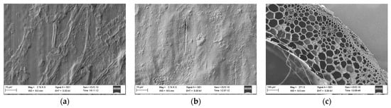 SEM images of untreated wheat straw: (a) outer surface of A sample; (b) outer surface of M sample; (c) cross-section of straw. In (a,b), the scale bar is 10 µm, magnification—2740 times; a scale of 100 µm with a magnification of 271 is used in (c).