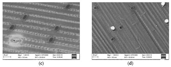 SEM images of pre-treated wheat straw: (a,b) outer surface of AC and AH samples; (c,d) outer surface of MC and MH. The scale bar is 20 µm; magnification—1400 times.