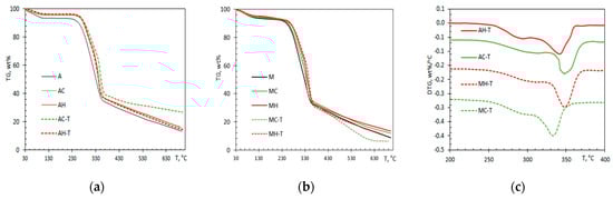 The degradation of straw was monitored by thermogravimetric analysis. Figure 4 shows the TG and DTG profiles. In the oxidizing atmosphere, the degradation reactions of the main constituents of straw, such as hemicellulose, cellulose, and lignin, take place [,,]. At around 130 °C during the dehydration and desorption stage [], the evaporation of moisture and degradation of hemicellulose occurs. The burnout of hemicellulose and cellulose with the removal of volatile matter starts from 200 °C, while the main decomposition of hemicellulose and cellulose lasts up to 370 °C in the combustion stage (Figure 4). During the char combustion stage, over 370 °C [], mainly the lignin decomposes.. It is worth mentioning that the decomposition of lignin starts in the same temperature range as that of hemicellulose and cellulose, but the process duration and chemical reactions depend on the heating rate and degradation atmosphere []. Figure 4 shows that the TGs of all samples have a similar shape, but two coldpre-treated and modified samples (AC-T and MC-T) distinguish, especially over 370 °C. It suggests that the effectiveness of modification depends both on the pre-treatment method and the variety of wheat, which is in line with the SEM observations (Figure 3). Weight losses, summarized in Table 3, show that the dehydration and degradation of hemicellulose (25–200 °C) proceed faster in the A sample than in M; meanwhile, the degradation of cellulose with lignin (200–370 °C) depends more on the pre-treatment method than on the wheat variety.