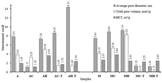 The SEM and TG observations correlate well with the nitrogen porosimetry results that provide valuable insights into the structural changes the straw samples undergo under different treatment conditions. The data obtained by the N2 physisorption, such as the total pore volume, specific surface area (BET), and average pore diameter, are summarized in Figure 5. Due to fragmentation, the degradation of straw constituents, and the formation of pinholes, the total pore volume tends to increase; however, the M samples show nearly twice higher values than the A samples after both cold and hot pre-treatment. This is in line with observations presented in [], where an increase in the temperature of the pre-treatment medium (both water and an acidic solution) by 15 °C (from 35 °C up to 50 °C) resulted in a doubling of the total pore volume and BET of straw. In this study, the threefold higher BET area of the A samples indicates that the hot treatment increases the surface roughness, which, according to [], may occur due to the possible formation of lignin scraps. The higher weight loss over 370 °C for the AH sample confirms this assumption (Table 3). On the contrary, the reduction in BET in the M samples suggests greater removal of substances from the surface.