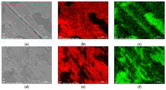 Mapping of pre-treated and modified wheat straw: SEM image of AC-T (a) with silicon (b) and carbon elemental distribution (c); SEM image of MH-T (d) with silicon (e) and carbon elemental distribution (f). The scale bar is 30 µm; magnification—1300 times.