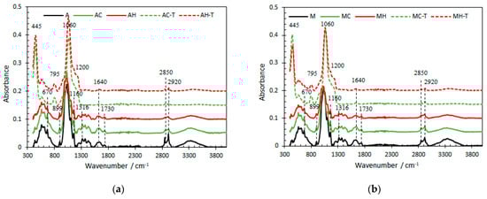 The spectra of the modified wheat straw surface (MC-T; MH-T//AC-T; AH-T) revealed prominent peaks at approximately 1200, 1060, 795, and 445 cm−1 (Figure 7). Peaks near 1060 cm−1 and 445 cm−1 are attributed to Si–O stretching, indicating the presence of silicon–oxygen bonds [,]. The peak at 1200 and 795 cm−1 is attributed to the symmetrical stretching vibrations of the Si–O–Si band [,]. The reduced intensity of the peak at 3417 cm−1 suggests the consumption of O-H during modification reactions []. All these intensities indicate the formation of a siloxane network on the wheat straw surface.