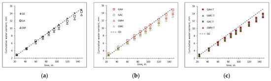 Cumulative water content of geopolymers: (a) geopolymers without straw (G0) and with unmodified straw of different varieties (GA, GM); (b) geopolymers with physically treated straw; (c) geopolymers with modified straw. See the nomenclature in Table 1.