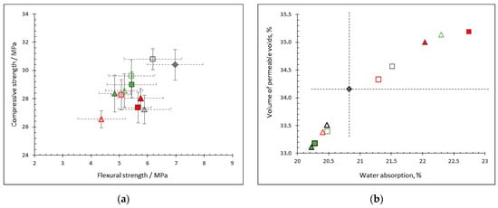 Mechanical strength (a) and water adsorption (b) of geopolymers reinforced with various treated wheat straws. Filled diamond (♦) corresponds to the reference material (G0). See the nomenclature in Table 1.