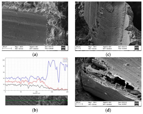 Geopolymer with the modified straw: (a) adhesion between geopolymer matrix and straw; (b) line scan on the boundary; (c) the bedding place of straw; (d) the damaged structure of the modified straw in the geopolymer. The scale bar is 200 µm; magnification—100–200 times.