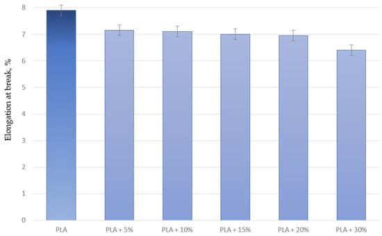 With an increase in the content of cork filler, a systematic decrease in the strength value is observed, almost by half when filling with 30% wt. (Figure 1). However, the deformation rate at break is insignificant (Figure 2). These changes suggest specific behavior of the material depending on the filler content. Increasing the cork filler content may lead to changes in the structure of the composite, which may include the formation of more cork particles in one place. This can also lead to areas of greater porosity or imperfections, which ultimately reduces the strength of the material. At the same time, such an uneven distribution of the filler in the matrix may change the way the load is distributed in the material and thus reduce its strength.