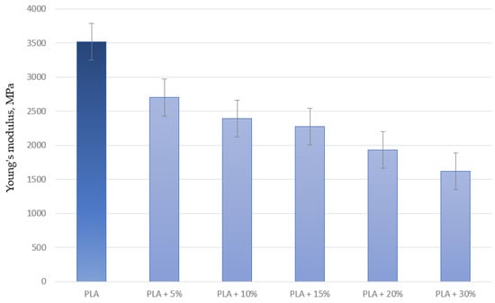 Young’s modulus is directly related to the measurement of material strength and deformability. Table 4 and Figure 3 present the results obtained. In this case, a slight decrease in this parameter is observed, which indicates the stiffness of the material. It can be concluded that the cork reduced the stiffness of the samples. Therefore, the addition of cork to a plastic matrix influences the interfacial relationship between the cork and the matrix. The weakening of these interactions can also lead to a decrease in the stiffness of the material, as evidenced by the results obtained.